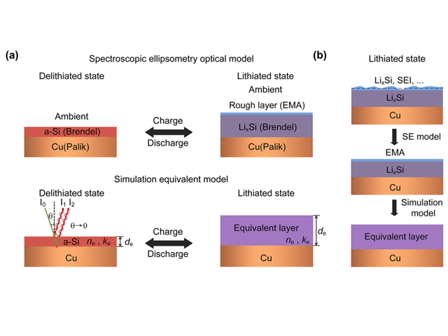 该团队通过实验和理论模拟进一步研究了该仿生变色器件中的电化学力学耦合变色机理。采用椭偏仪测试了其不同锂化程度下的纳米硅薄膜的光学常数(折射率和消光系数),以及相对应的纳米硅薄膜的厚度,验证了锂化纳米硅薄膜的化学演化过程。通过建立光学理论模型,预测出不同嵌锂程度下的器件反射率,其预测结果和实验测试吻合,进一步验证了该仿生变色器件的调控机理。
