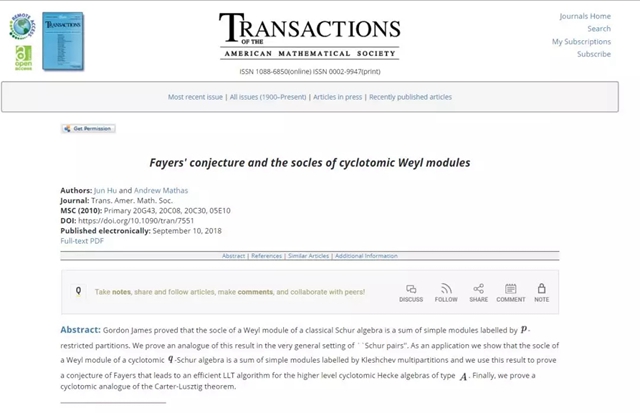 米兰milan官方网站数学与统计学院胡峻教授在国际顶级学术期刊《Transactions of the American Mathematical Society》上发表了题为“Fayers’conjecture and the socle of cyclotomic Weyl modules”的研究论文。该论文研究了分圆Schur代数的分圆Weyl模的基座,证明了这些基座中的单模全部都是由Kleshchev多重剖分来参数化,并在此基础上证明了英国代数学家Fayers提出的关于Fock空间典范基的一个猜想。