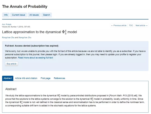 米兰朱蓉禅副教授在《The Annals of Probability》上发表ϕ_3^4动力模型格点逼近的研究成果