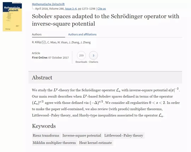 米兰张军勇特别研究员在《Mathematische Zeitschrift》上发表含反平方位势薛定谔算子的研究成果