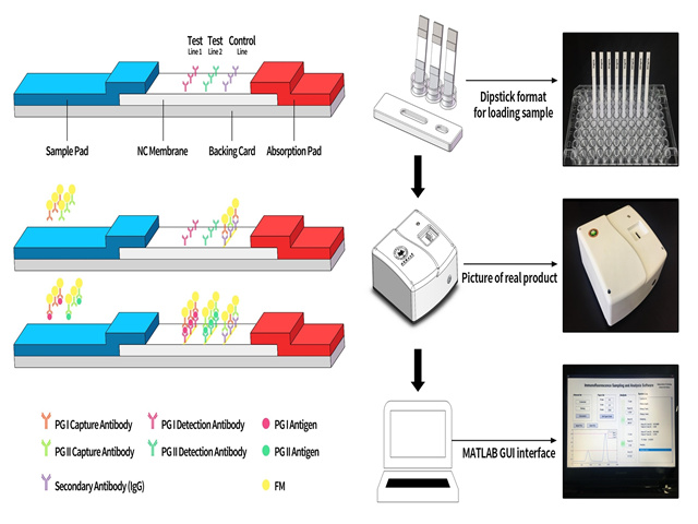 胃癌的早期诊断和治疗是胃癌防治的重要手段,可以提高存活率并对预后防控提供有效的指导,所以应在胃癌高发地区大力推广早癌筛查工作。胃蛋白酶原(PG)属于胃粘膜分泌的特定蛋白酶组,可分为两大类:胃蛋白酶原I(PG I)和胃蛋白酶原II(PG II)。PG的分泌水平反映了胃粘膜的形态和功能状态,被在同样是胃癌高发地区的日本和韩国作为胃癌筛查的生物标志物应用于全国范围性的筛查工作。然而,目前用于检测PG I和PG II的方法耗时耗力,且需要专业的实验室环境配备,不适用于我国的胃癌大规模筛查,亟需一种可以实现快速且灵敏的PG I和PG II同时检测方法,为大规模胃癌筛查提供可行方案。