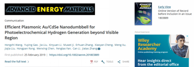 团队与中科院大连化物所李灿院士团队合作,在金属@半导体异质纳米结构研究积累基础上(Science, 2010; Adv. Mater., 2014; Angew. Chem. Int. Ed., 2015; Adv. Mater., 2016; Nano Energy, 2018; Nano Energy, 2019; J. Mater. Chem. Mater. A, 2018)通过精确调控Au/Ag核壳纳米晶的硒化反应以及逆向竞争的水相阳离子交换反应,实现了从核壳结构(core/shell)到哑铃结构(nanodumbbell)演变的Au/CdSe异质纳米棒的制备及异质界面的高质量构建。得益于Au棒的纵向SPR效应及两端的电磁场增强“热点”以及高质量的异质界面,制备的Au/CdSe HNRs在近红外区具有很强的光吸收特性,实现了Plasmon增强的高效热电子注入效应。结合空间分辨的表面光电压成像表征(与李灿院士团队合作),成功研发出一种在近红外光波段具有高的吸收效率,又具有高的可见-近红外光电催化产氢性能,且其法拉第效率高达96%的光电催化材料。光电催化产氢活性(45.29 μmol cm-2 h-1)通过5天的连续测试,没有明显降低。米兰的王虹智博士研究生以及大连化物所的高玉英博士研究生为共同第一作者。相关工作以“Efficient plasmonic Au/CdSe Nano-dumbbell for Photoelectrochemical Hydrogen Generation beyond Visible Region”为题,在线发表在Advanced Energy Materials (2019, DOI: 10.1002/aenm.201803889)上。