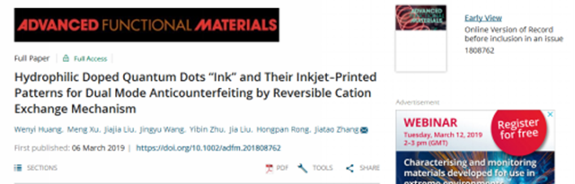 团队基于已有的半导体掺杂纳米晶/量子点研发基础(Angew. Chem. 2015; Adv. Mater. 2015; Nature Nanotech. 2018; Angew Chem. 2018),发现了Ag掺杂CdX(X="S," Se等)等II-VI族量子点的可逆阳离子交换(Ag2X与CdX之间的可逆转化)可多次实现有无荧光的切换。然后通过表面配体交换以及掺杂量子点分散在碱性水/乙二醇溶剂中,实现了可控粘度的“墨水”制备。进而实现了掺杂量子点在不同衬底(羊皮纸,纸币,PET等柔性衬底)上的喷墨打印和图案化(宏观厘米、分米尺寸器件规模)。利用可控的荧光切换实现了更高安全性的多模式防伪应用。相关工作以“Hydrophilic Doped Quantum Dots “Ink” and Their Inkjet-Printed Patterns for Dual Mode Anti-Counterfeiting by Reversible Cation Exchange Mechanism”为题,在Advanced Functional Materials (DOI: 10.1002/adfm.201808762)在线发表。黄文艺硕士研究生和徐萌讲师为论文共同第一作者。