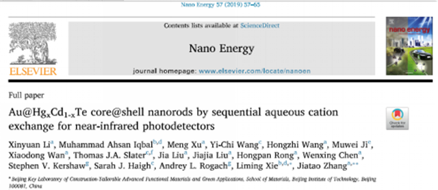 团队在Au@HgxCd1-xTe金属/碲化物半导体核壳纳米棒的精准合成基础上,基于壳层材料的窄带隙特点以及Au纳米棒的表面等离子体共振效应,实现连续可调的可见光-近红外吸收特性。与国家纳米中心谢黎明研究员团队(光电探测器件表征)、英国曼彻斯特大学Sarah J. Haigh教授(高分辨STEM表征)、香港城市大学Andrey L. Rogach教授(海外名师计划资助)合作,利用石墨烯高载流子迁移率的特点,实现了石墨烯/Au@HgxCd1-xTe纳米棒光电器件的合成。所合成的器件实现了可见光到近红外宽波段(550-1300 nm)的高光响应效率(~106 A/W)。展示了其在红外光电探测领域方面的应用价值。相关工作以“Au@HgxCd1-xTe core@shell nanorods by sequential aqueous cation exchange for near-infrared photodetectors”为题发表在Nano Energy 杂志上(2019, 57, 57-65)。李欣远博士研究生为论文第一作者。