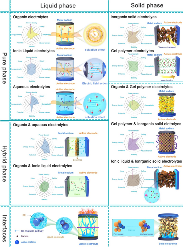 图2 具有不同状态(液体和固体)和组分(纯相和混合相)的钠离子电池电解质和界面的模型,以及这些电解质和相应界面的主要性质