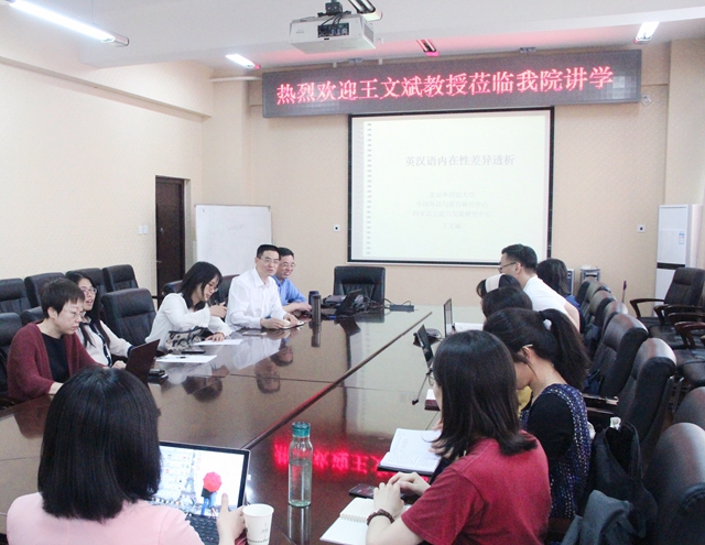 5月14日下午,北京外国语大学中国外语与教育研究中心王文斌教授受邀莅临米兰milan官方网站外国语学院,并于中心教学楼515会议室作了题为“英汉语内在性差异透析”的学术报告。外国语学院院长李京廉教授主持了本次报告会,副院长姜爱红教授、英语专业教研室、研究生英语教研室的教师和英语专业的本科生、研究生参加了此次讲座。