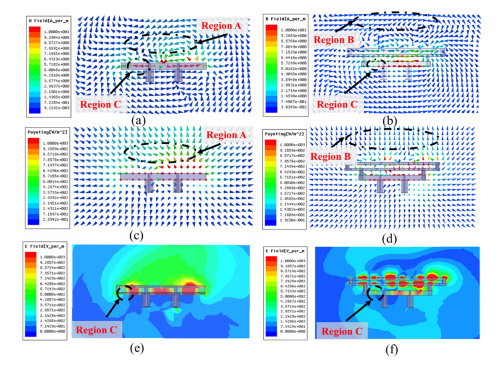 加载超材料前后磁场H、坡印廷矢量S、电场E近场分布示意图