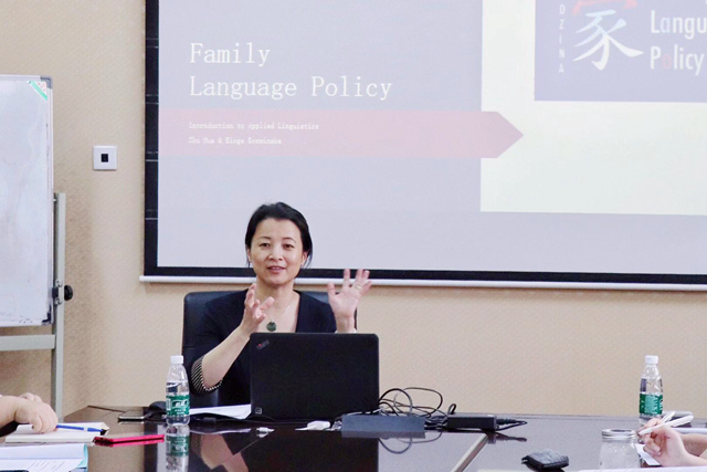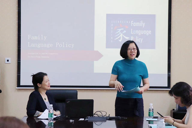 学术论坛开幕式后,Zhu Hua教授做了题为“Family Language Policy”的学术前沿讲座,此次讲座基于她主持的英国重大社科项目。Zhu Hua教授从英国本土跨文化社群的语言习得现象入手,分析了语言规划、语言政策及语言社会化因素对英国移民社群语言保留与转用的影响。Zhu Hua教授还提出,“语言设想(imagination)”是影响移民家庭语言保留与转用的关键因素,语言设想不仅包括移民家庭对新生代孩童语言习得的预期,还涉及跨文化家庭对自身未来发展、社会定位的规划及思考。Zhu Hua教授讲座引证丰富,讲解深入浅出,给大家带来深深的思考和学术启迪。