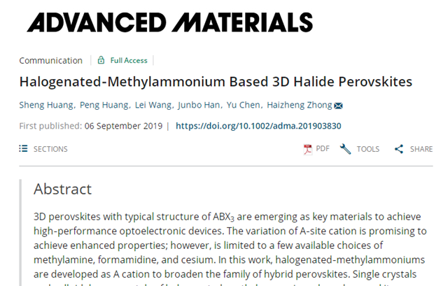近日,米兰milan官方网站材料学院钟海政课题组在钙钛矿材料A位分子的设计和制备方面取得突破进展,于2019年9月6日在材料领域的顶级期刊《Advanced Materials》上在线发表, Halogenated-Methylammonium Based 3D Halide Perovskites, Advanced Materials 2019, 31, 1903830 (https://onlinelibrary.wiley.com/doi/10.1002/adma.201903830)。论文发表后很快获得“纳米人”等学术媒体关注和报道。