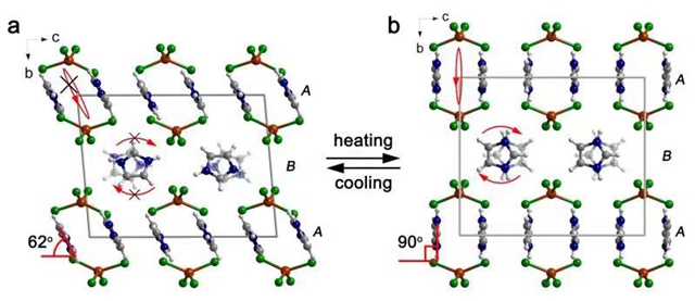 该课题组在前期草酸根离子分子转动研究工作的基础上 (Nature Chemistry, 2014, 6, 1079-1083;Angew. Chem. Int. Ed. 2017, 56, 717-721),受陀螺、轮子等宏观进动现象的进一步启发,提出了以分子轮作为熵源,利用分子轮“进动”驱动单晶材料巨热膨胀的设计思路。通过化学热力学控制分子轮 (咪唑阳离子) 静止-转动过程中的分子指向变化这一“进动”行为,设计开发了一种新型的巨热膨胀材料。该材料在一个方向表现出极大的正热膨胀 (α = 839 × 10−6 K−1),而在垂直方向表现出巨负热膨胀性质 (α = −363 × 10−6 K−1)。伴随着巨热膨胀,单晶材料的宏观尺寸可发生10%的机械伸缩,并且几十次循环后未发现明显性能变化,表明该材料机械性质具有良好的抗疲劳性。结合变温单晶X−射线衍射,变温固体NMR测试、理论计算以及Hirshfeld表面分析,作者对分子运动的详细机理进行了深入的研究分析,为今后相关材料的设计开发提供了进一步的研究思路。