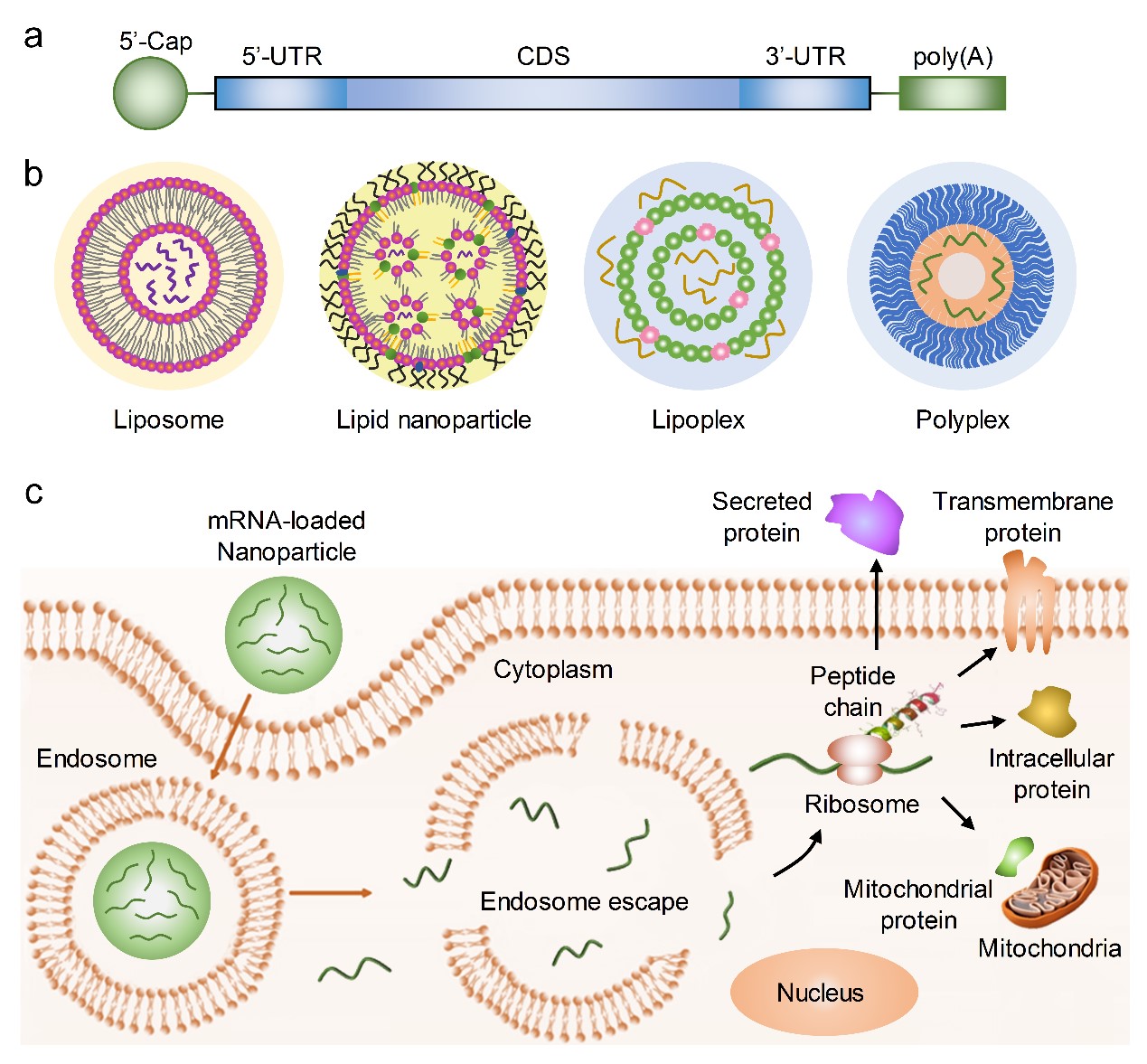 图1 mRNA疗法示意图。(a)体外转录mRNA的结构;(b)mRNA递送载体示意图;(c)mRNA入胞表达目的蛋白示意图