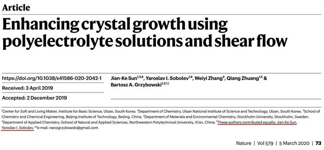 近日,米兰milan官方网站化学与化工学院孙建科教授以《Enhancing crystal growth using polyelectrolyte solutions and shear flow》为题,将其“剪切促进晶体生长”研究成果发表于《Nature》杂志上(Nature 2020, 579, 73-79)。孙建科为该论文的共同第一作者,化学与化工学院为共同合作单位,排名第三。此研究是与韩国基础科学研究院Bartosz Grzybowski 教授合作完成。