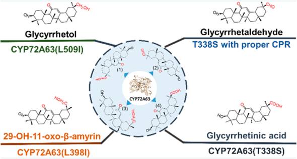 本文利用甘草中合成甘草次酸的P450单加氧酶CYP72A63基于同源建模与分子对接等技术进行辅助理性设计,重塑其活性口袋以控制对于不同中间产物的契合度。通过提高甘草次醇的契合度实现了甘草次酸特异性合成,通过降低甘草次醇的契合度防止了其进一步氧化实现了甘草次醇的特异性合成。通过控制C-29和C-30相对于血红素铁的相对位置,实现了对底物C-29的特异性氧化,进一步通过CPR的匹配优化首次实现了甘草次醛类中间产物的特异性合成。同时利用酿酒酵母的体内验证方式解决了突变体体外试验难以进行的问题。