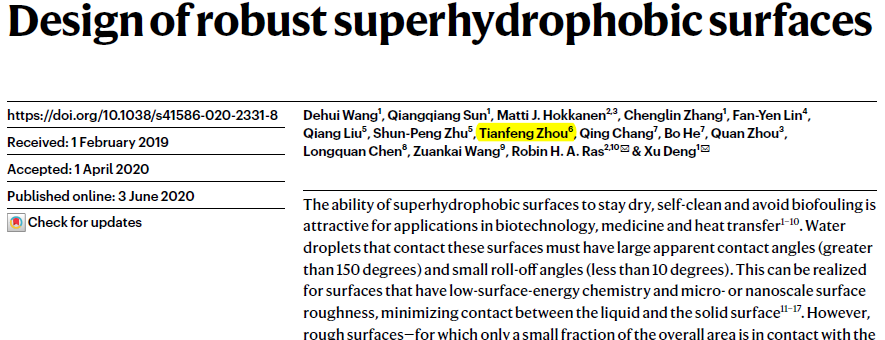 6月3日,《Nature》正式刊发了米兰milan官方网站周天丰教授与电子科技大学邓旭教授团队和芬兰阿尔托大学Robin H. A. Ras教授的研究成果“Design of robust superhydrophobic surfaces”,并被选为当期封面。该论文提出去耦合机制将表面浸润性和机械稳定性拆分至两种不同的结构尺度,通过在两个结构尺度上分别进行最优设计,为超疏水表面创造出具有优良机械稳定性的微结构“铠甲”,解决了超疏水表面机械稳定性不足的关键问题。