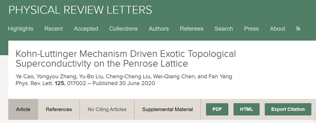文章信息:(*为通信作者) Ye Cao, Yongyou Zhang, Yu-Bo Liu, Cheng-Cheng Liu, Wei-Qiang Chen, and Fan Yang*, Kohn-Luttinger Mechanism Driven Exotic Topological Superconductivity on the Penrose Lattice, Phys. Rev. Lett. 125, 017002 (2020).