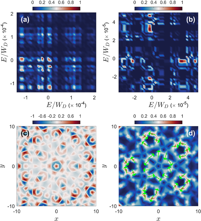 前人的工作大部分局限于对单电子行为的描述,对于从微观角度研究电子的关联行为还处于空白,而他们的工作着眼于此。他们从微扰论方法出发,使用费曼图技术将粒子-空穴形的激发计及在内,把周期性系统中著名的Kohn-Luttinger机制推广到了非周期性的准晶系统,构造出了二阶有效哈密顿量,并以此为基础对彭罗斯系统的超导性质进行了系统研究。借助大规模数值计算,他们得到了电子填充-相互作用的相图,相图表明在弱相互作用下,四种拓扑超导态中的三种会出现,均具有非平庸的拓扑数。进一步计算表明,这些拓扑超导态均破坏时间反演,因此会产生自发的体超流。