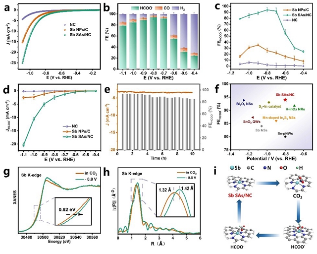 人类向大气中排放的二氧化碳不断增加,引起了巨大的气候变化。利用可持续能源发电,将二氧化碳转化为一系列高附加值产品,作为解决能源短缺和环境问题的有效途径,越来越受到重视。甲酸或甲酸盐是一类重要的储氢材料,也是许多工业反应中的关键化学中间体,电化学方法还原CO2生产甲酸或甲酸盐被认为是目前最具经济可行性的技术方案。陈文星等构筑了一种以Sb-N4为主体的Sb单原子催化剂(Sb SAs/NC)可以高效催化CO2RR转化为甲酸盐,Sb SAs/NC在−0.8 V (vs. RHE)下表现出高达94.0%的甲酸法拉第效率。原位X射线吸收精细结构(XAFS)研究和密度泛函理论(DFT)计算表明,优异的CO2RR活性来源于带正电的Sbδ+-N4(0<δ<3)活性中心。本研究结果对原子尺度上合理设计和精确调控CO2RR的主族金属(Sb、In、Sn、Bi等)催化剂具有重要的指导意义。