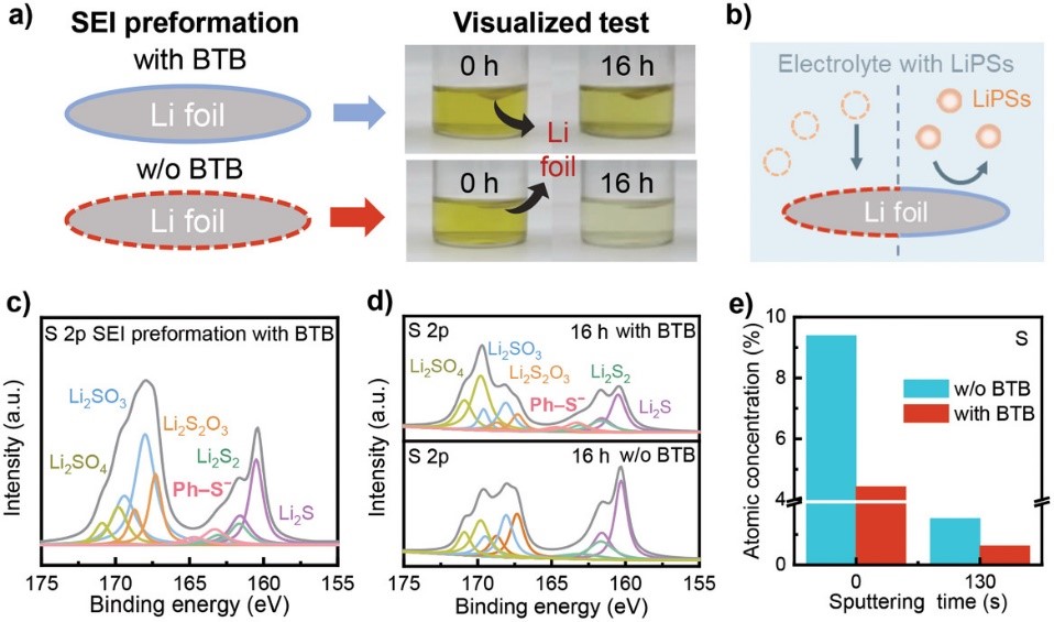 根据可视化实验和XPS,验证了BTB参与调控的含有机硫的SEI可以有效抑制多硫化物与金属锂的副作用,并且其组分可以稳定存在于SEI。