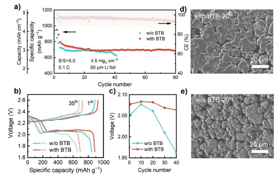本工作通过引入3,5-双三氟甲基苯硫酚(BTB)作为电解液添加剂,设计了一种可以“屏蔽”多硫化物的含有机硫的固态电解质界面(SEI),以保护金属锂负极,在实用化条件下提升了锂硫电池的稳定性和循环寿命。