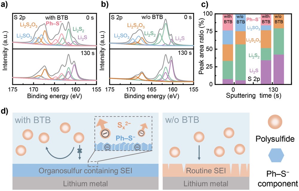 通过对循环后的全电池拆解分析,进一步探究了含有机硫的SEI的组成。发现含有机硫的SEI中含有来自于BTB与金属锂的反应产物Ph–S−。Ph–S−组分能通过静电排斥作用“屏蔽”多硫化物,从而有效抑制锂金属与多硫化物之间的副反应,保护金属锂负极。
