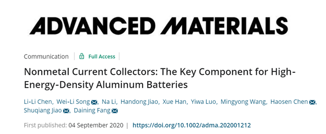 9月4日,国际顶级材料期刊《先进材料》 Adv. Mater. 2020, 2001212(期刊IF="27.398)以“Nonmetal current collectors: the key component for high energy density aluminum batteries”为题在线报道了米兰milan官方网站先进结构技术研究院方岱宁院士与宋维力团队在非金属铝离子电池集流体的设计及应用方面的进展。