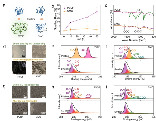 图3. 粘结剂特征。(a)粘结剂膨胀前后示意图。(b)不同浸泡时间下粘结剂膨胀率的数值结果。(c)不同粘结剂的傅里叶变换红外光谱(FTIR)结果。(d)不同粘结剂膨胀试验前后图片。(e)纯PVDF膨胀前后的C1s XPS数据。(f)纯CMC膜膨胀前后的C1s XPS数据。(g)循环伏安法(CV)试验前后使用不同粘结剂的不同电极的光学显微镜图像。(h) CV试验前后使用PVDF粘结剂的C 1S XPS数据。(i) CV测试前后使用CMC粘结剂的正极C 1S XPS数据。