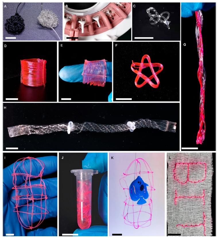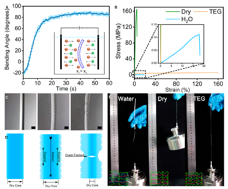 然而此纤维机械强度依旧不足以支持进一步的加工与应用。因此,作者将水凝胶纤维置于三甘醇中对其进行了溶剂置换,在此过程中,水凝胶纤维中的水分子被移除,带来机械强度提高,同时少量三甘醇进入到凝胶网络中,相较简单干燥的干胶纤维,三甘醇置换所得的凝胶网络得以维持一定柔韧性。