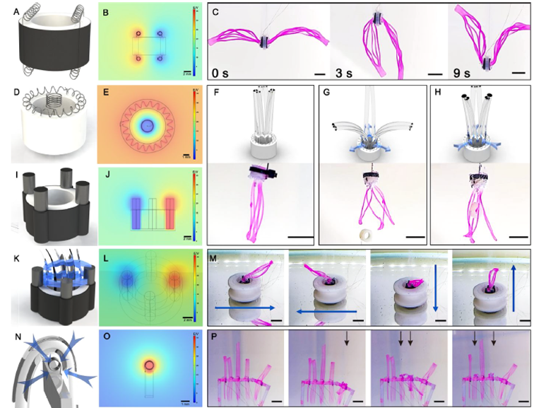 最后,作者利用COMSOL有限元模拟辅助进行了电极的设计,将电极与编织结构相结合,制造出了一系列水下仿生软体机器人。