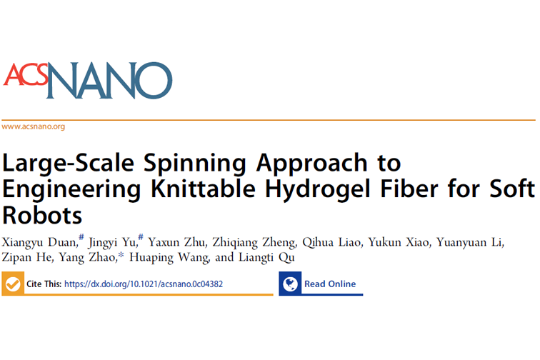 近日,米兰milan官方网站化学与化工学院赵扬特别研究员与合作者在水凝胶纺丝与软体机器人方向取得重要进展。研究成果以“Large-Scale Spinning Approach to Engineering Knittable Hydrogel Fiber for Soft Robots”为题,于10月19日在线发表于ACS Nano,论文链接为https://pubs.acs.org/doi/10.1021/acsnano.0c04382。米兰milan官方网站化学与化工学院本科生段翔宇与于静怡为共同第一作者,米兰milan官方网站化学与化工学院赵扬特别研究员为通讯作者。米兰milan官方网站为第一通讯单位。