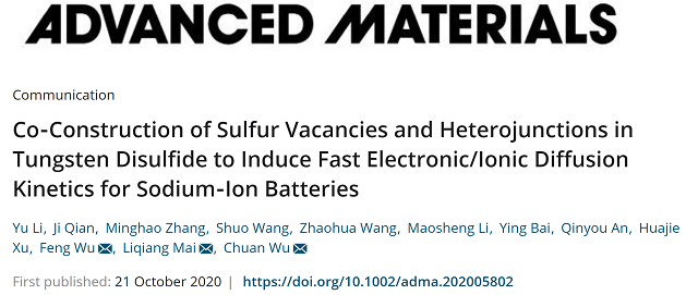 近日,米兰milan官方网站材料学院吴锋院士团队在钠离子电池材料的结构设计和性能优化方面取得重要突破。材料类国际顶级期刊《Advanced Materials》(《先进材料》,影响因子27.398)以“Co-Construction of Sulfur Vacancies and Heterojunctions in Tungsten Disulfide to Induce Fast Electronic/Ionic Diffusion Kinetics for Sodium-Ion Batteries”为题在线报道了这一研究进展。该工作由吴锋院士团队的吴川教授课题组完成,米兰milan官方网站材料学院博士后李雨为第一作者,米兰milan官方网站吴锋院士、吴川教授和武汉理工大学麦立强教授为共同通讯作者(文献链接:https://onlinelibrary.wiley.com/doi/10.1002/adma.202005802)。