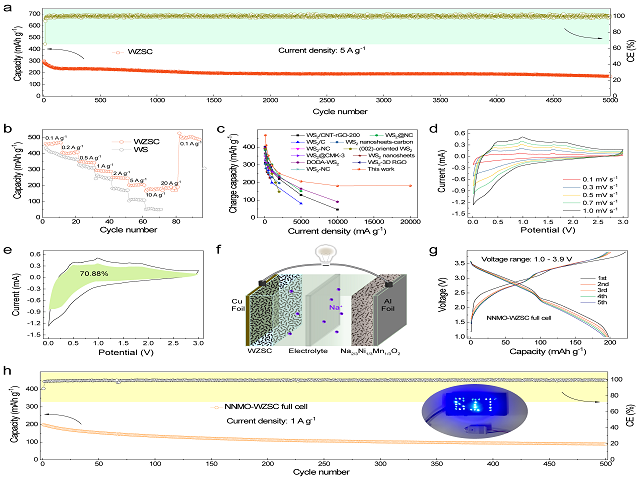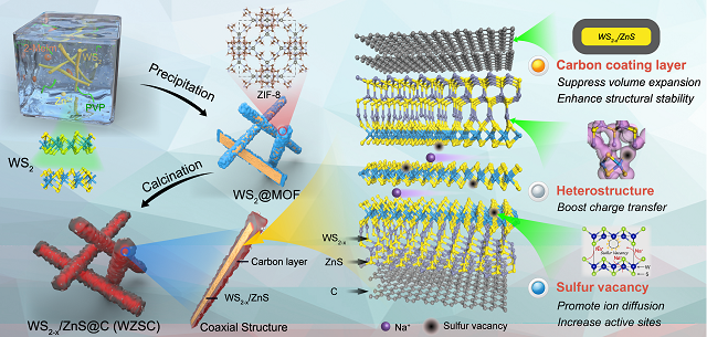 基于上述思想,吴川教授课题组首次报道了一种具有硫空位和异质结构的双金属硫化物/碳复合材料,该材料展示出快速的电化学动力学特性和出色的可逆容量。该合成手段“一石三鸟”,通过引入金属有机框架材料,能够在WS2纳米棒的表面原位生长均匀的ZIF-8层。经煅烧处理后,WS2表面上形成了均匀的碳保护层。此外,由于金属Zn和W的电负性差异, Zn与S更易结合,原位生成WS2/ZnS异质结构;同时在WS2中形成丰富的硫空位。该复合材料具备以下优点:1)均匀的碳包覆层促进电子快速迁移并提供良好的电导性,同时抑制循环过程中材料的体积膨胀,从而保证复合材料的结构稳定性;2)形成的WS2/ZnS异质结构能够产生内置电场效应,促进额外的电荷转移,以增强反应动力学;3)WS2晶体中产生的硫空位不仅可以提供更多的反应活性位点,还可以诱导W金属原子周围产生过量电子,形成负电荷中心,加速Na+的快速传输。该创新成果突破了二维过渡金属硫族化合物的钠离子电池动力学壁垒,对能源材料的优化设计以及高比能动力电池的构建,提供前瞻性的理论支撑。
