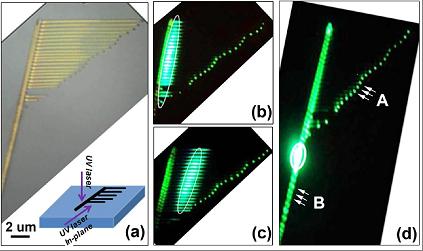 为此米兰milan官方网站纳米光子学与超精密光电系统北京市重点实验室的刘瑞斌副教授、硕士生张春花在邹炳锁教授带领下,在基金委青年基金、校创新团队基金、校重大预研基金等项目支持下,在一维半导体阵列结构制备及光子学行为的研究上取得了重要突破:利用本团队前期首次实现的II-VI族半导体周期性超晶格--CdS/SnS2一维光子晶体线(http://pubs.acs.org/doi/pdf/10.1021/ja1037963)为基体模板,通过反复试验,成功发明了一种一步气相法制备CdS一维单晶线阵列梳状结构的方法, 获得了角度可调、周期尺度可调的梳状结构,并与海外合作者研究了其微结构和高效的光波导行为(见下图),结果显示不同方向传播的光子耦合效率比量子线交叉传播大大增强,为下一步一维微纳光子器件的构建与应用打下了坚实的基础。