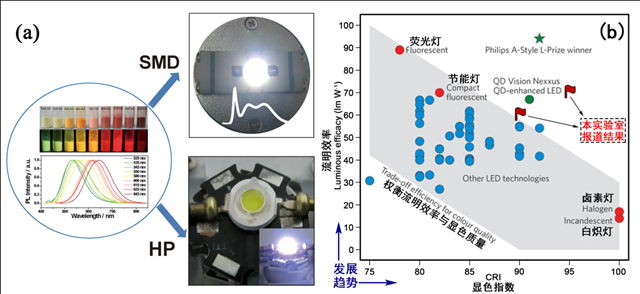 图1. (a)米兰所制备的纳米晶荧光粉材料及所制备的白光LED器件;(b)米兰所制备纳米晶白光LED性能与文献中现有白光照明技术参数的对比,红旗所在点为米兰2013年报道数据,其他数据来自Nature Photonics, 2013, 7, 13-23综述。