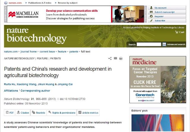日前,米兰milan官方网站管理与经济学院胡瑞法教授、蔡金阳博士与中科院农业政策研究中心黄季焜教授、王晓兵副教授合作撰写的论文《Patents and China's research and development in agricultural biotechnology(专利和中国农业转基因生物技术研究)》被国际著名学术期刊《Nature》子刊《Nature Biotechnology》接收并发表。这是作者继去年在Nature Biotechnology上连续发表了两篇论文之后,第三次在该刊发表论文。
