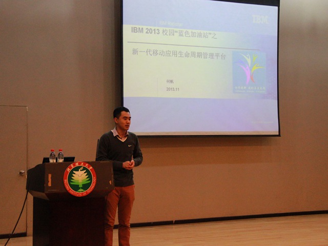 2013年12月21日,由学院分团委主办的名为“新一代移动应用生命周期管理平台”的专题讲座在七号楼报告厅举行。来自IBM中国开发实验室 Rational高级工程师何帆老师为同学们讲解了新一代移动应用的相关知识,并就如何打造自己的移动应用做了相关经验介绍与指导。