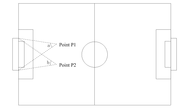 根据对球门威胁的不同,和足球比赛的规则,可以将球场划分多个区域。场地划分主要是根据球所在的位置进行的。而场地的分块线,主要是根据球的射门角作为主要依据的。如图1所示,假设P点和p1点为门前任意一点。当a=b时,P点和P1对门的威胁程度相同。