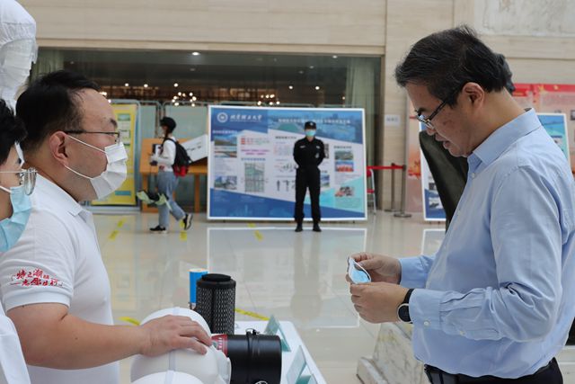 宇航学院飞鹰队“猎鹰”无人机、机电学院便携式爆炸物检测仪、机械与车辆学院无人智能巡检与运输无人平台和酷黑科技飞天工兵、光电学院耐德佳超大视场角AR头戴显示设备、信息与电子学院星网测通和垃圾分类机器人、自动化学院瞳赋AI红外测温设备和无人机全自主柔性起降系统、材料学院藿然而愈团队、化学与化工学院MOFilter分子智能技术及其产品参与现场展示。
