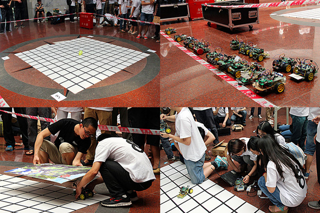 比赛区域为一块长240厘米,宽240厘米的正方形场地。底板为白色,底板上绘有黑色正交坐标线,线宽1.5厘米。比赛分为展示、初赛和复赛三个环节进行。展示环节中,27个参赛队的小车模型整齐亮相;初赛要求参赛智能车携带大头针从指定区域出发,到达场地中心将气球扎破,并返回出发区准确停泊入位;复赛采用三轮淘汰制,允许车模使用与初赛不同的程序,但要求场上车模左右及尾部用夹子各固定一个气球,车模在争取扎破场地上不同位置气球的同时,也设法扎破对方车身上的气球。场上四辆车同时展开角逐,吸引了许多师生驻足观看,现场气氛非常热烈。