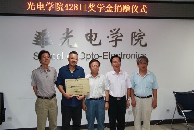 2014年7月7日下午,光电学院42811奖学金捐赠仪式在信息楼2023会议室举行。该奖学金由光电学院42811班校友捐赠,奖励光电学院品学兼优的本科生和研究生。副校长杨宾,学校对外工作委员会主任焦文俊,校友会办公室主任段丽萍,校基金会主任罗雪,42811班校友代表王双、吴志敏、孙文龙、梁列国,光电学院党委书记郝群、副书记副院长邹锐和学生代表参加了捐赠仪式。