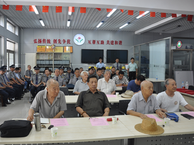 赵宏宇同志向汇报会致辞。他首先向各位思想疏导师长期以来对校园安保工作的大力支持,共同营造一个和谐稳定的校园环境表示衷心的感谢!党建工作室成立已经有4年之久,一直秉承弘扬传统、创先争优、互帮互助、共建和谐的工作宗旨。各位老同志们作为思想疏导师,牺牲自己宝贵的时间,利用多年来的丰富阅历和政治优势,始终不渝的将这些优良传统传授给我们年轻的保卫干部和保安员同志们,使我们汲取了很多的正能量,老同志们也帮助我们分担、解决了很多难点难题,为校园安保工作把握好很多的大方向,今天借此机会再一次向老同志们表示感谢。2014年上半年保安员评选工作经所有保安员参与,进行初选及第二轮入围优秀保安员答辩评选(入围答辩的保安员全部自行制作PPT演示文件进行现场汇报),乃至后续的暑期保安员素质拓展训练评比,逐渐锻炼保安员与人沟通、协作的能力,学会从敢说到能说再到会说的转变,通过评选以评促建,加大保安员之间的交流,相互之间取长补短,形成默契。最终,评选奖项规划设置为:先锋模范保安员,优秀保安员标兵,优秀保安员,优质服务保安员,新兵奖以及优秀保安员管理干部。在这里希望我们的保安员能够将评选以及素质拓展训练中总结的经验和获得的知识运用在工作中,进一步增强保安员的服务意识和服务质量。