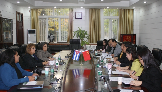 古巴使馆教育专员Karina María Caballero Rubiella、古巴教育部国际司官员Yisell Masforrol Portal、我校国际交流合作处副处长高珊、项目官员彭姝、留学生中心主任助理沈佳培、西班牙语系曾艳等也参加了会见。
