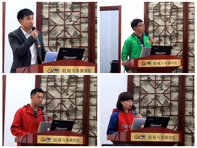 方程式赛车工作室负责人、机械与车辆学院2013级研究生董路宁带领大家共同回顾了2014年的整体历程,介绍了“技术骨干+后备梯队”的队伍建设情况、“稳定+灵活”的总体技术路线、“技术研究+管理运营”的日常管理模式,同时,分析了国内外兄弟高校近年来的发展概况和大学生方程式的技术趋势。机械与车辆学院2010级本科生陈浩翰、张闯、叶山顶,机械与车辆学院2011级本科生刘旭泽,机电学院2010级本科生刘力源,设计与艺术学院2011级本科生陈南瑾分别作为各技术组骨干介绍了相关技术的演进历程、方案选择过程及依据、未来技术建议,并实事求是地对2015年预期发展目标做了分析;基础教育学院2013级车辆工程专业本科生俞灏岑作为梯队成员讲述了“创新实践引导课程学习,理论储备促进实践锻炼”的过程和感受。指导教师代表张付军教授对同学们一年来的成长和成果表示肯定,建议在今后的工作中一方面不断学习他人之长,永远抱着学习的心态去追寻,另一方面也要注重理论学习,从理论上寻找解决实践问题的方法。