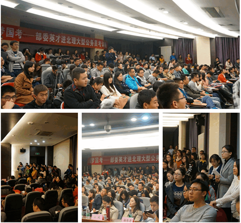 11月5日晚,由管理与经济学院研究生会举办的“筑梦国考”——部委英才进北理大型公务员公益讲座在研究生楼101会议厅举行。来自中央国家机关团工委、外交部、公安部、民政部、国家审计署、国家质检总局、中国进出口银行、国家知识产权局、国家工商总局、人民出版社、中央办公厅等中央国家机关、直属单位的优秀青年公务员,为同学们介绍公务员工作内容、讲述真实工作感受并与同学们分享国家公务员考试备考经验。校团委书记蔺伟老师、管理与经济学院团委书记彭明雪老师、管理与经济学院研工委书记梁昊老师出席了活动,全校多个院系的400余名同学参加了本次活动。