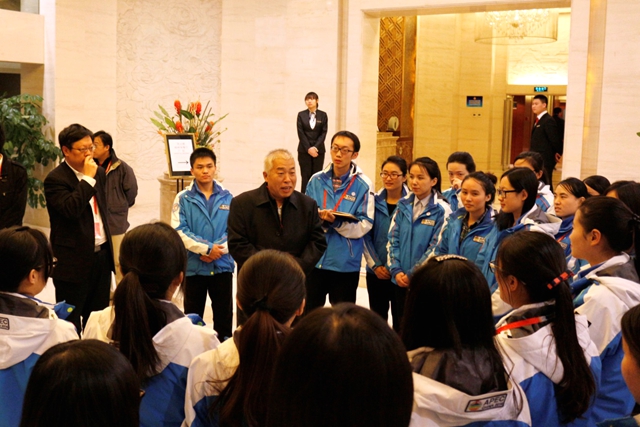 在国家会议中心组志愿者的慰问交流中,杨海滨副书记首先对我校志愿者的付出表达了感谢与敬意。他指出志愿者的良好服务是APEC会议顺利举行的重要保障,每一名志愿者都是展示国家的一张名片,希望所有的志愿者都要以饱满的精神、认真的态度面对每天看似平凡却别有意义的工作。一则则幽默风趣故事折射出他对各位志愿者的殷切期望,站好自己的一班岗,向世界展示中国风采。