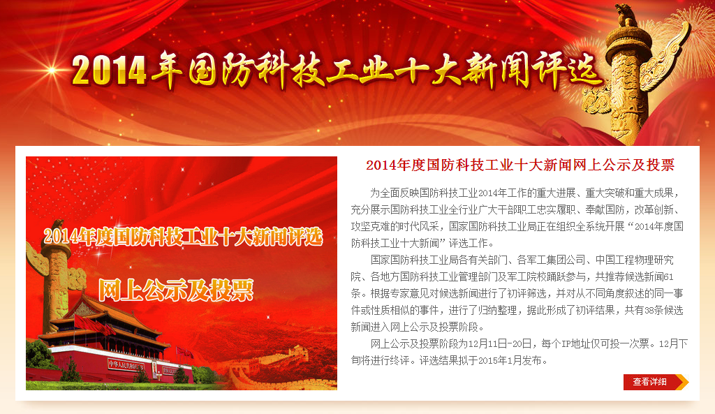 米兰两项新闻入选2014年国防科技工业十大新闻候选条目