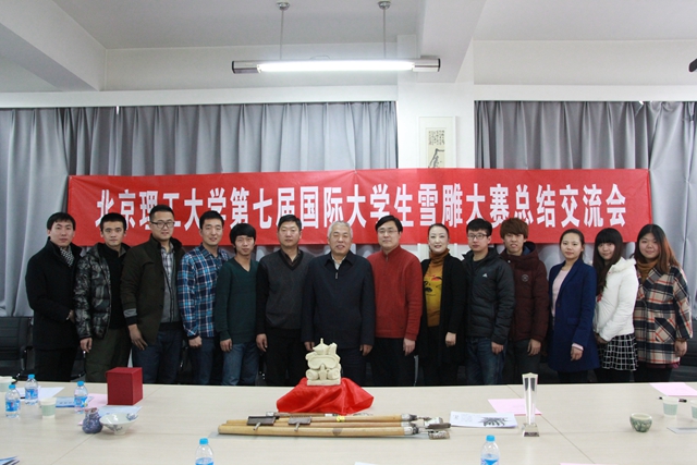 各参赛师生依次发言,老队员周谷川与大家分享了连续参加三届雪雕大赛的经验和感悟,刘晓峰、王世壮、董大琨等同学分别介绍了雪雕前期稿件的征集、方案调整、泥稿设计、后勤宣传等相关情况以及参加雪雕大赛的感悟与思考。随队老师欧阳哲和陈丽健也作了简短发言,对校领导及学院领导的大力支持表示感谢。