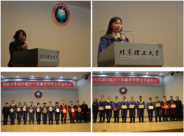左正兴教授宣读了《关于准予2015届(春季)研究生毕业和授予学位的决定》,范文辉宣读了《2015届春季优秀毕业研究生名单》,车辆工程系主任刘辉教授、制造工程系主任刘检华教授、动力工程及工程热物理学科责任教授马朝臣教授、机电科学基础部主任王文中教授先后为获得市级、校级优秀毕业生的同学颁发证书。