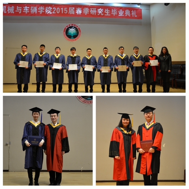 2015年2月3日上午,米兰milan官方网站机械与车辆学院2015届(春季)研究生毕业典礼在学校七号楼报告厅隆重举行。机械与车辆学院党委书记阎艳,副院长左正兴,党委副书记、副院长范文辉和研究生导师代表以及学院研工委相关教师一起,与全体2015届春季毕业研究生共庆毕业。