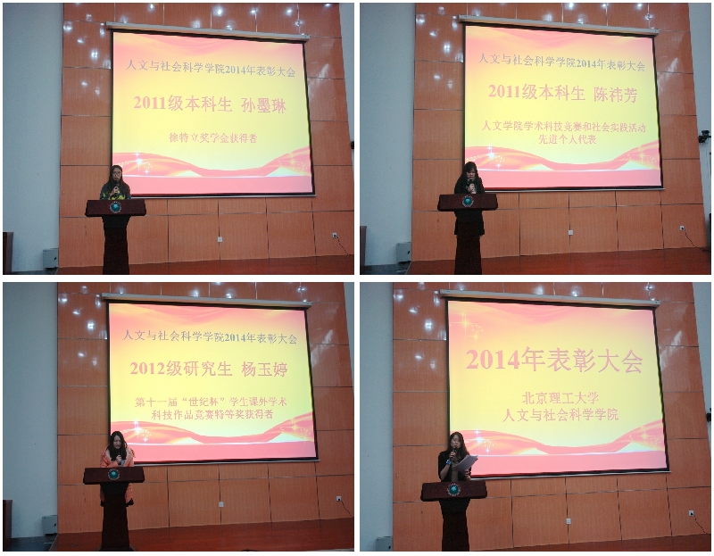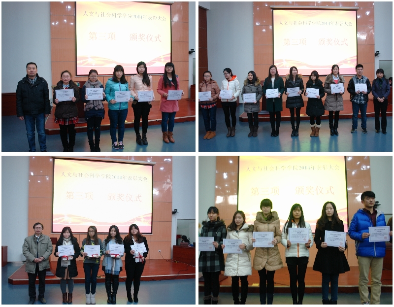 表彰大会在全场齐唱激昂奋进的国歌中拉开序幕,随后,由学院副院长贾利军宣读《关于人文与社会科学学院2014年度学生学术创新与实践先进个人、先进团队的表彰决定》。贾院长希望获奖集体和个人珍惜荣誉再接再厉,开拓进取,再创佳绩;也鼓励同学们以他们为榜样勤奋学习,以更加饱满的热情投入到多彩的大学学习、生活和工作中,并祝愿全体同学在2015年取得更优异的成绩。