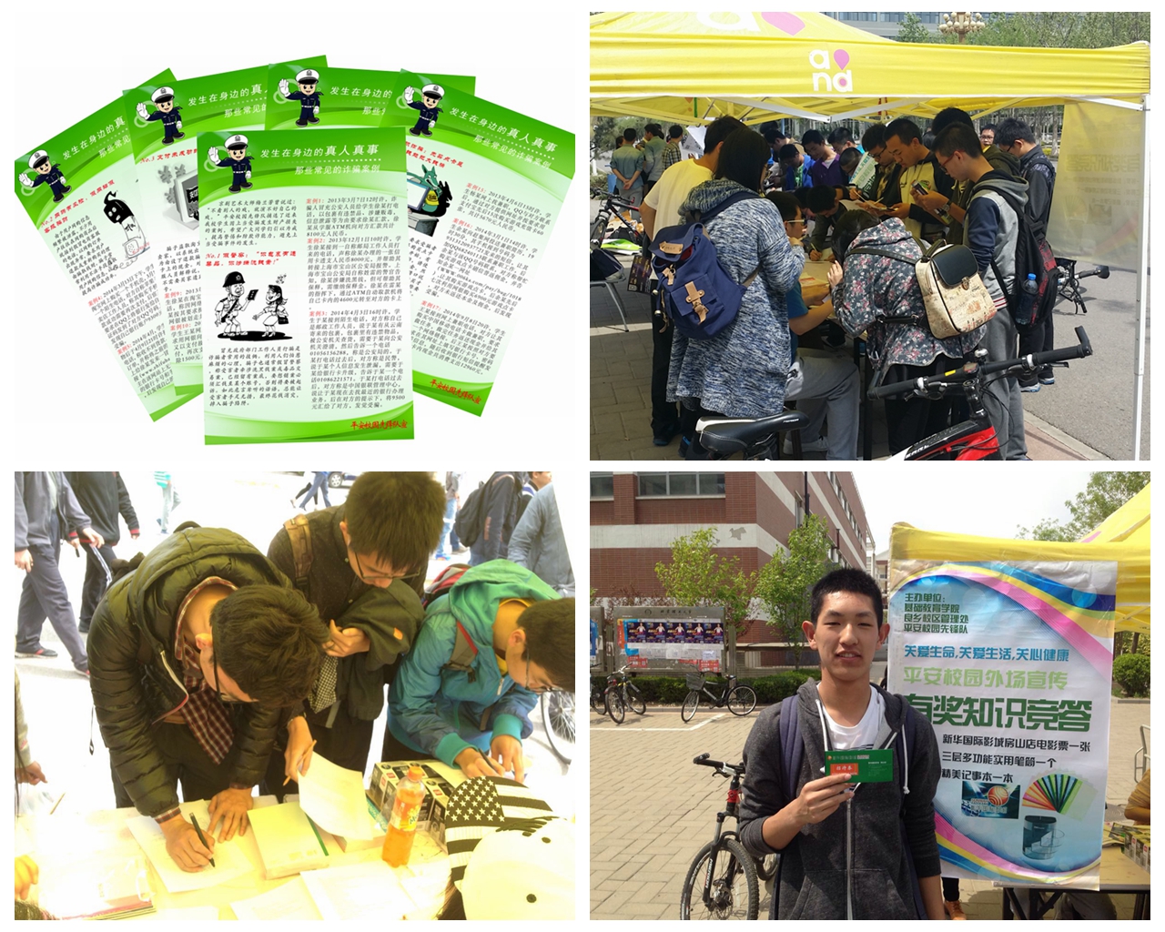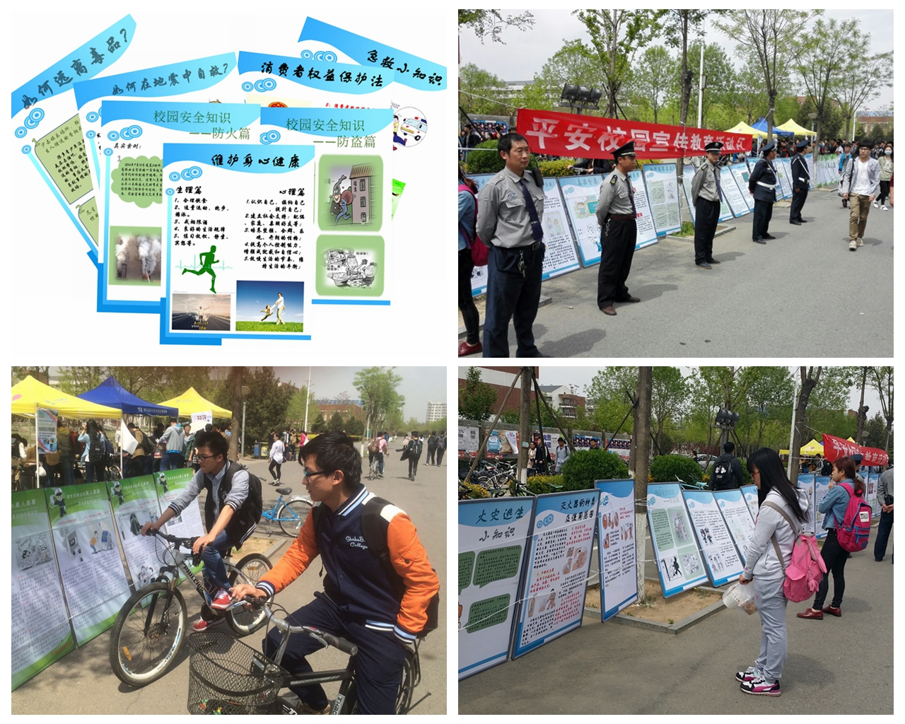 此次活动共展出展板30余块,内容涉及防火、防盗、防诈骗、地震、毒品、急救、心理健康、消费者权益保护等涉及学生生命、健康和生活方面的知识及典型案例,尤其是展出了2014年良乡校区学生因诈骗遭受经济损失的“真人真事”案例集,期望广大学生能够引以为戒,提高警惕和防其诈能力,避免受骗事件的发生。